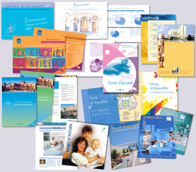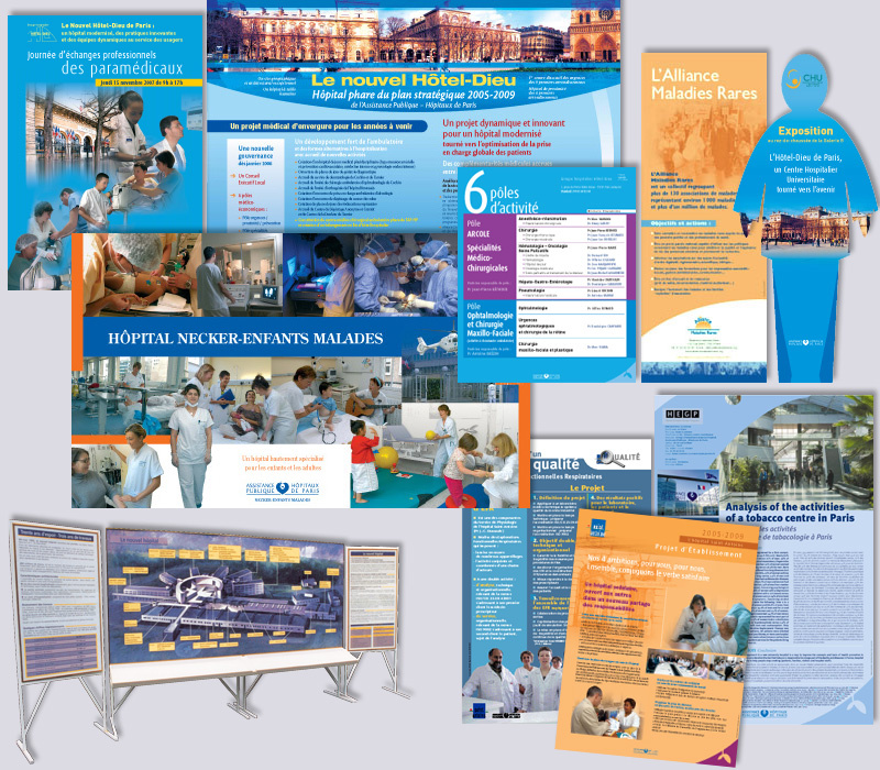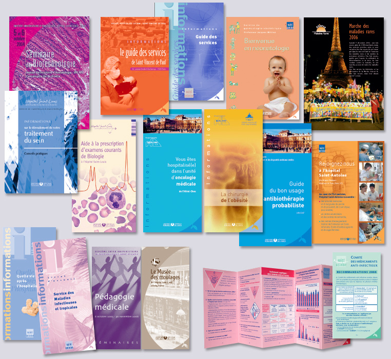 Plaquettes réalisées pour les hôpitaux Bicêtre, Saint-Louis, Hôtel-Dieu, Saint-Antoine, Bretonneau, Ambroise Paré et Cochin. |
